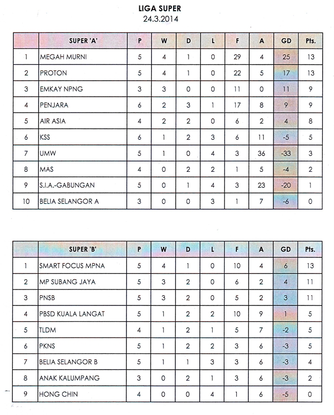 Keputusan Liga Super Sehingga 24 Mac 2014